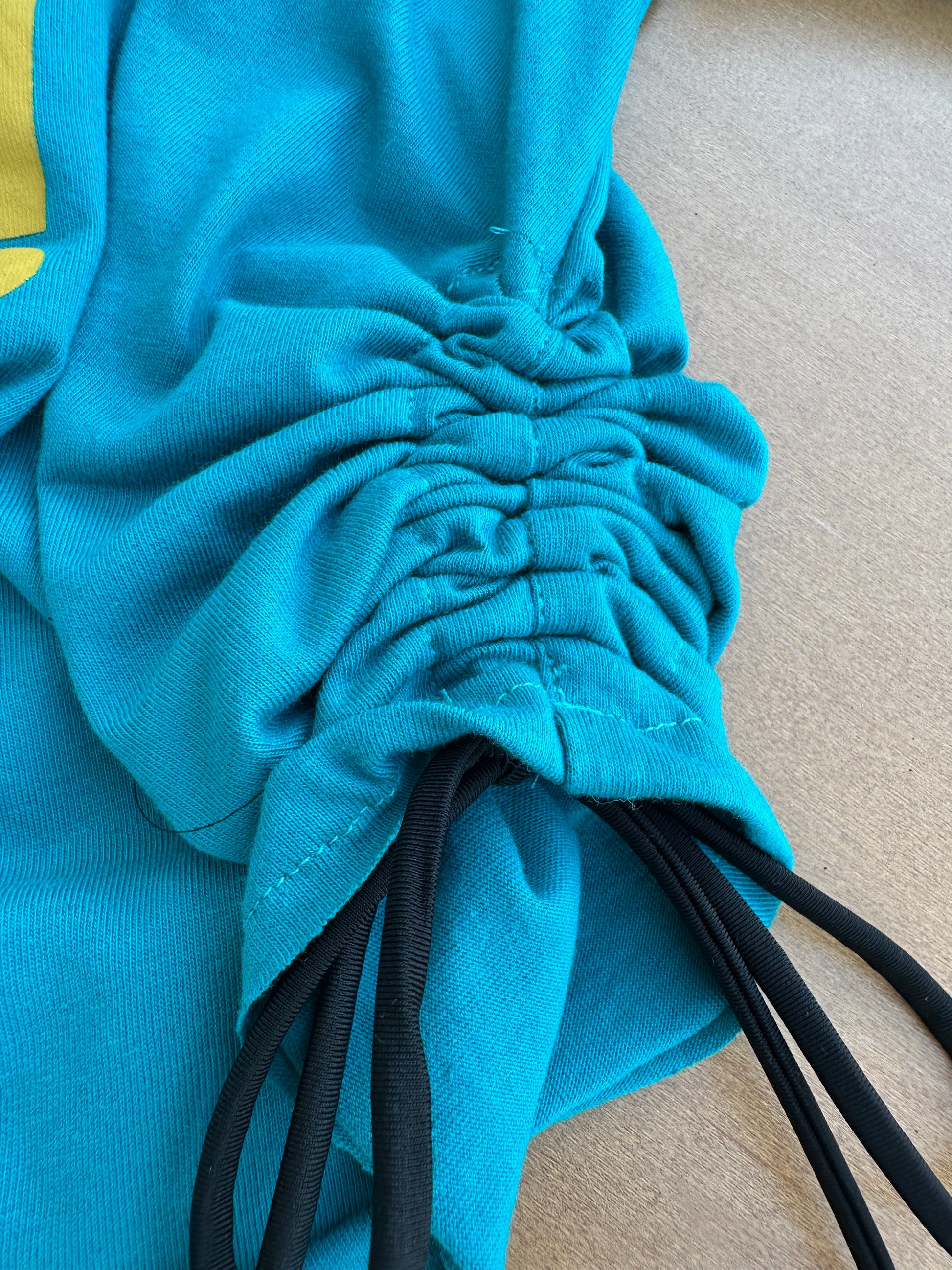 - Adjustable side ruching with black ties for a trendy, flattering fit